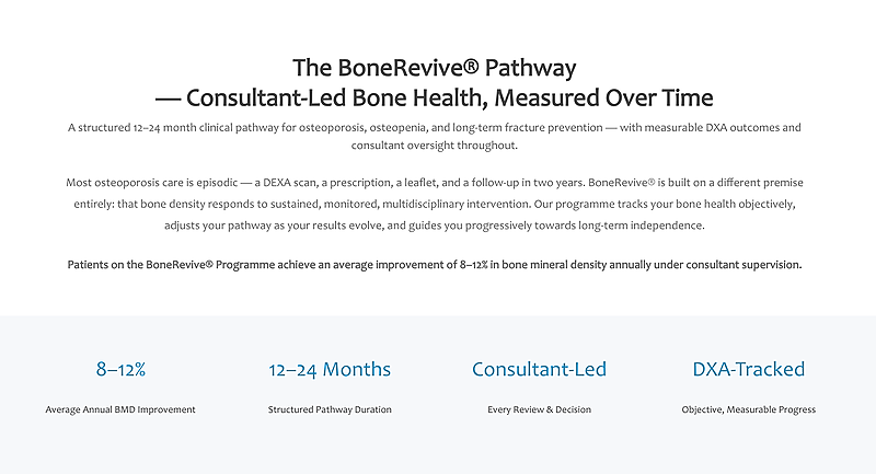 BundleStructured bone health pathway by the London Osteoporosis Clinic™. BoneRevive® Core provides consultant review every 3 months with targeted investigations and partial test coverage to monitor progress, optimise bone density, and reduce fracture risk.